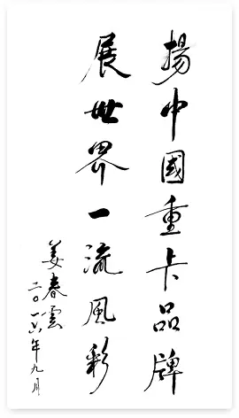 Comrade Jiang Chunyun wrote an inscription as "Advocate the Brand of Chinese Heavy Duty Trucks, and Display the World-class Demeanor"